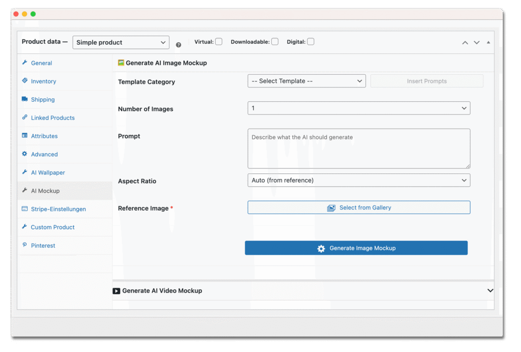 AI Mockup Maker is a WooCommerce plugin that uses artificial intelligence to generate photorealistic product mockups and short marketing videos from a single reference image. It streamlines the entire mockup workflow by handling image generation, cropping, and product assignment directly inside your WooCommerce dashboard.